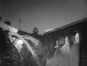The writers also concoct some truly memorable cliffhangers, which are helped along mightily by Howard and Theodore Lydecker’s miniature work. The exploding paint factory at the end of Chapter One is justly one of the Lydeckers’ most famous pieces of work; its (over) use as stock footage in later Republic serials shouldn’t take away from its high quality. The Chapter Fourteen cliffhanger (with Rex Bennett’s boat sailing over a spillway), the Chapter Nine cliffhanger (with Bennett trapped aboard an exploding submarine), and the Chapter Six cliffhanger (with Bennett atop a pylon tower being approached by a chain of explosions along the power line) also show the Lydeckers’ genius to full advantage; indeed, nearly all of the cliffhangers involve a Lydecker miniature (and generally an explosion too) in one form or another. The few chapter-ending sequences that don’t utilize miniatures are memorable as well, especially the climax to Chapter Eight, in which Constance Worth is apparently skewered by an elaborate Japanese spear-gun trap.