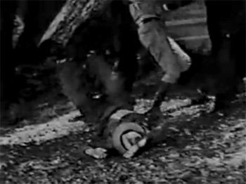 The Iron Claw possesses some pretty good cliffhanger sequences (such as the one in which the Claw runs a mine car full of explosives down a track towards a shack containing Quigley), along with some laughably overdone cliffhangers (such as the one in which the Claw attempts to kill our heroes by trapping them in a mine cave-in and then setting the mine tunnel on fire into the bargain). There are also a lot of energetic fight scenes scattered throughout the serial, but most of them, in typical Horne tradition, are rendered comedic rather than exciting by the impossible number of foes that the hero takes on at one time (sometimes as many as six at once). Horne does include an interesting visual effect in several of the fight sequences; instead of keeping the camera focused on the main brawl at all times, the lens follows individual combatants in a continuous take as they’re knocked to the floor, leap up again, and charge back into the fight.