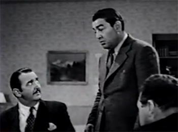 Above left: Cy Schindell (standing) laments the death of a colleague, while Charles King (seated left) looks annoyed. Above right: James Morton (center) is puzzled as Alex Callam (left) and Allen Doone hurl accusations at each other.