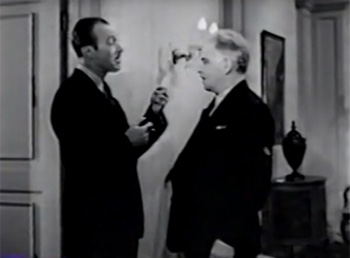 Above left: Forrest Taylor loudly gives orders to his long-suffering butler/accomplice John Beck. Above right: Norman Willis (left) sneers sarcastically at the suspicious James Metcalfe.