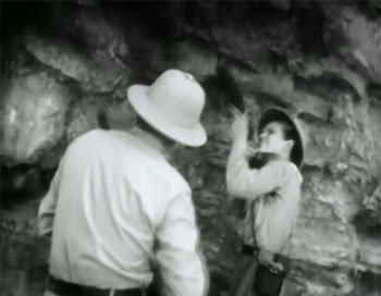 after professor tyler gets shot in the cave he inconsistently alternates between being a seriously injured person and a rousing “Gotta save my son” papa. At one point he is helping to remove tim from the cave, and in the very next shot he and tim have traded places, and he is the one being helped along. another not fully convincing scene is tim’s rescue of his friends from the savage natives whose white leader is very briefly shown. with the aid of his elephant pal he captures just two of the bad natives; then the the whole tribe abruptly disappears. Like most cliffhangers this one uses action footage more than once, although this becomes noticable only when you watch the whole thing all at once, which is not the way they were meant to be watched.