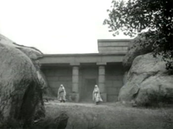 This well-paced narrative plays out in an impressive variety of indoor sets and outdoor locations–the honeycomb of tunnels in the Tuareg valley, Vultura’s mammoth palace and the cliffs nearby, numerous caverns, and various rocky hillsides. Of all Republic’s serials set in foreign realms, Nyoka manages to be the most successful in creating a believably exotic atmosphere; it helps that semi-arid Californian locales like Iverson’s Movie Ranch and Corriganville can more convincingly double for the North African hills than they could for other African locales, like the sub-equatorial jungles or the Sahara desert.