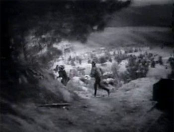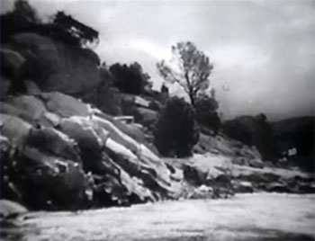 Above left: A search party of friendly Indians in the Kernville hills. Above right: Two thugs flee from an unsuccessful foray into the hilltop mine, with the Kernville scenery spread out below.