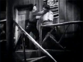 The action scenes in Frontiers are rarely spectacular, but are very frequent and are also very well-executed by directors Ray Taylor and Alan James–with the partial exception of a few large-scale Indian attacks that, while exciting, are marred by too-obvious use of the aforementioned stock footage. Johnny Mack Brown’s ambushing of a small group of Indians from a rocky outcropping in Chapter Three is well-done, as is his fight with Eaton’s henchmen in the saloon in Chapter Four. Other highlights include the shootout at the cabin in Chapter Six (as a fire blazes in its cellar), the fight inside another cabin in Chapter Nine, the excellent shootout in the rocks in Chapter Ten and the ensuing chase, the good guys’ crossing of a stream under villainous fire in Chapter Thirteen, and the Chapter Fourteen sequence that has Brown fighting Charles King in Tom Grant’s cabin and Chief Thundercloud battling Charles Stevens in the mine beneath–as a burning fuse prepares to blow them all sky-high.