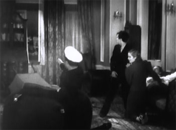Above: Frankie Darro pleads for Henry B. Walthall (far left), who’s about to be arrested. Hale Hamilton (far right) feigns sympathy, while Niles Welch glowers.