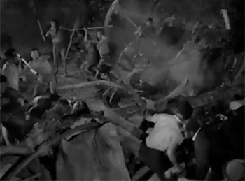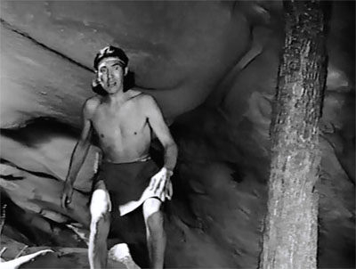 The action scenes which dot this narrative are consistently excellent; the fistfights that would become Republic’s hallmark within a few years were not yet a studio fixture, and while there are plenty of well-handled physical combats throughout the serial, they’re not elaborately choreographed in the fashion of the studio’s later brawls. This isn’t to say the action scenes aren’t well-staged; in fact, they surpass many later Republic setpieces when it comes to a sense of real excitement and danger. A few examples include the aforementioned climactic knife-fight, Kioga’s tussle with two Indians on the verge of a tiger pit, his fight with the pirates near a dangerous deadfall trap, the nighttime Indian attacks on the expedition in Chapters One and Nine, the hillside battle with the Indians in Chapter Ten, Kias and Kioga’s pursuit of a murderous “demon” through a cave full of volcanic smoke, and the escape from the Indian village in Chapter Two (during which Ted Mapes, doubling Herman Brix, makes a flying leap over the heads of several Indians, climbs to the roof of a thatched lodge, and scales a wooden wall).
