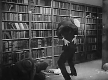 Director Spencer Bennet (who, like Dickey, would soon become a Republic mainstay) handles the serial’s action scenes with his customary flair–although, without the stunt team, superior production values, and increased budget for breakaway props he would enjoy at Republic, he delivers no setpieces to match the fights in serials like Secret Service in Darkest Africa and Manhunt of Mystery Island. That said, some of the serial’s fights are quite impressive, especially the laboratory brawl in Chapter One, the later lab fight in Chapter Ten, and the mammoth battle at the villains’ bookstore hideout in Chapter Fourteen, which takes heroes Paul Kelly and Clancy Cooper and an assortment of heavies down a flight of stairs and into the bookstore itself–where they leap across tables piled with magazines, jump from bookshelf ladders, and perform other entertaining stunts.