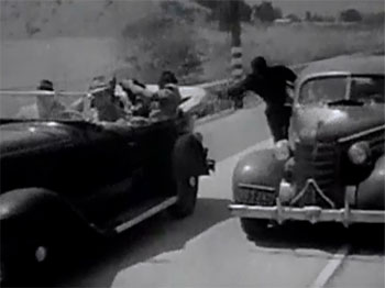 Above left: The Black Commando’s wire-slide escape. Above right: The Commando transfers to the villains’ car as Anne Nagel struggles with heavies in the back seat.