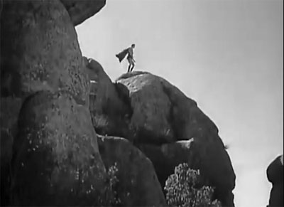The serial’s locations alternate between the Columbia backlot–which furnishes suitably impressive buildings for the Daily Planet and for Metropolis University (where the ray machine is stored for awhile)–and the reliable Bronson Canyon area–both its winding roads, which do good service in a couple of car-chase sequences, and its famous cave, which functions as the entrance to the Spider Lady’s hideout. The Canyon region also figures as a backdrop to the action in other sequences, and is striking enough to even add a bit of visual interest to some of the aforementioned Superman-in-flight scenes.