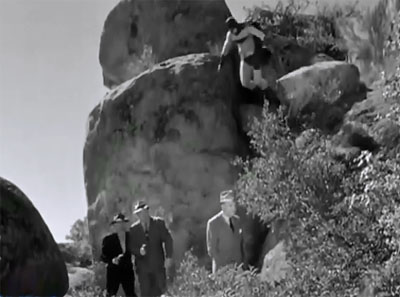 Fight scenes are generally brief, and, although well-handled by director Spencer Bennet, steer carefully away from the kind of large-scale set destruction Bennet featured in his Republic outings (a strong case in point being the fight among the boxes in Chapter Eight, which is nicely done but gingerly avoids toppling more than a few of the props, no doubt to the relief of economical producer Katzman). The Chapter Five fight on the dock is also good, but most of the serial’s brawls are far shorter, with either the Dynamic Duo or their opponents going down for the count after a dozen punches are thrown. The most memorable pieces of action are some of the quick throwaway bits, like Batman’s impressive leap from a rock onto a pair of henchmen in Chapter Seven, or his smashing two thugs’ heads together in Chapter Four.