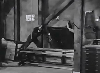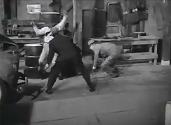 Above: Dale Van Sickel uses Ken Terrell to knock over some stacked oil drums while Tom Steele picks himself up off the floor (left); Van Sickel and Steele topple a filing cabinet during the same sequence (right). Both shots are from the Chapter Eight garage fight.