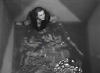 The non-explosive cliffhangers are memorable as well, particularly the cleverly-resolved Chapter Two ladder fall, the Chapter Ten ending that has the hero being forced against a row of spikes by a moving wall, and the Chapter Six ending with the heroine trapped in a cell filling with water. This latter sequence–well-intercut with the hero’s fight to shut the water off and filmed at striking camera angles that accentuate the terror of the situation–just might rank as the best version of the oft-used “drowning room” cliffhanger in any serial (its only competition would be the similar scene in Terry and the Pirates).