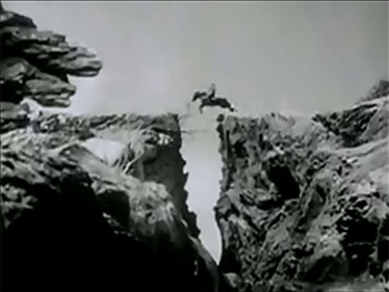Above left: Dave Sharpe fights Jimmy Fawcett as Duke Green prepares to leap into the fray from a saloon balcony. Above right: A stuntman doubling Don Barry (probably Joe Yrigoyen) jumps his horse across Beale’s Cut.