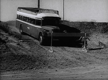 The serial’s chapter endings are largely composed of respectable if understandably mundane car, train, and plane crashes–really imaginative cliffhanger setpieces would have spoiled Hornet’s comparatively realistic atmosphere. The Chapter Three car/gas-station explosion, the Chapter Seven bridge collapse, and the Chapter Ten mined-road ending are among the serial’s best, all of them featuring some good miniature work; the Chapter One flood ending, in which we actually see the Hornet caught by the raging waters (unlike the heroes in other, process-screen serial floods) is also memorable. Perhaps the most interesting ending, however–if also the least spectacular–is the Chapter Nine one, which has the Hornet trapped in a closet full of choking acid fumes by his unwitting friend Axford; the resolution to this peril is particularly clever.
