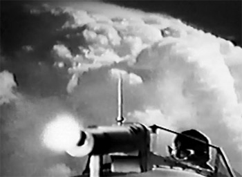 Above: Forbes Murray (far left, civilian garb), Don Beddoe (center), and Allan Cavan (far right, uniform) watch a bomber test.