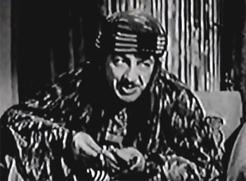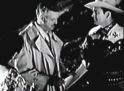 Hugh Prosser is good as the concerned and intelligent police captain, while Ted Mapes is likable in his periodical appearances as easygoing rancher Tex Collier. The lovably disreputable Emmett Lynn is very funny as a scraggly and garrulous carnival barker, Ted Adams gets to be colorfully shifty in a small but pivotal role as Prince Amil’s treacherous vizier, and Frank Merlo is stoically sinister as one of Amil’s faithful servants. Rusty Wescoatt gets to play a good guy for once (a tough blacksmith), while Kermit Maynard appears as a policeman. An unidentified actor does an energetic character turn as Sid, the irritable director of the movie-within-a-movie that Greg Saunders is shooting throughout the serial. In a previous version of this review I identified this actor as director Wallace Fox himself, following the Internet Movie Database’s crediting; however, I have since determined that the IMDB is wrong and that the “director” of Saunders’ movie is not Fox, leaving the actual actor’s identity a riddle to me.