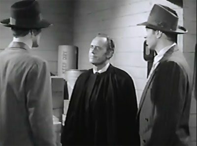 All of the aforementioned stock scenes–expect for the ship sequence–are utilized as chapter endings; most of the serial’s new cliffhanger sequences are good but predictably less spectacular–a safe door falling on the heroine, the hero’s apparent electrocution. One of the new cliffhangers, however, is unusually striking for a late Republic chapter ending: the hero and heroine’s extremely well-filmed Chapter Six flight down a mine tunnel, pursued by a coal-oil barrel (mounted on a mine-car) that’s bringing a train of flame in its wake; this excellent scene ranks as one of the best of Republic’s 1950s chapter endings.
