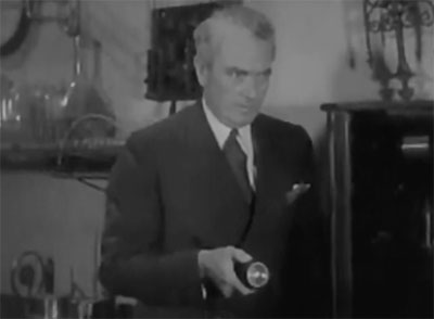 Former English music-hall performer Jimmy Aubrey goes outrageously and completely over the top” as “the hag,” a seedy old “woman” who serves as a messenger for the Scorpion’s gang–leering, slobbering, and cackling with complete abandon in both dialogue and non-dialogue scenes. Aubrey also hams it up in a second role as Baron Polinka, a shady Continental dignitary with his own plans for the death ray; as the Baron, he overlays his noticeable Cockney accent with a cartoonishly broad “foreign” accent that’s more comical than convincing. William Farrell also overdoes his accent a little, but is much more slick and aristocratic–and quite effective overall–in his turn as the wily Count Basil Segeloff.