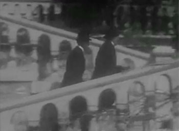 Above, top left: The “Duchess” (Lucille Lund) and a henchman pull up at a Limehouse “dock.” Top right: The villainous butler Daggett in one of the secret passages. Bottom left: Two dignitaries climb the stairs outside Mallow Hall. Bottom right: A meeting in the less impressive interior of Mallow Hall.
