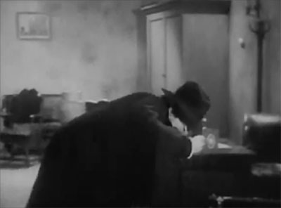 An unidentified actor appears as the boarding-house proprietor’s gigantic half-wit son, a muscular menace who gasps and growls in rather unnerving fashion and makes a frightening attack on Blake to end Chapter Twelve (I think this unidentified player could be Jerry Frank, but his continual facial distortions make it hard to tell). John Harron and Henry Hall play Scotland Yard men; the latter might provide the Scorpion’s voice as well. The villain is definitely not dubbed by the actor who’s eventually unmasked as the culprit, and Hall’s euphonious quasi-British voice certainly sounds similar to the Scorpion’s; considering the other players who take double parts in the serial, it’s hard to imagine Katzman hiring an additional actor solely for voice-over duty, an expense he usually avoided even in his slightly higher-budgeted Columbia serials.