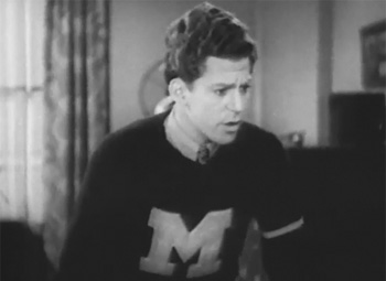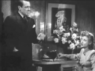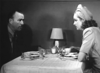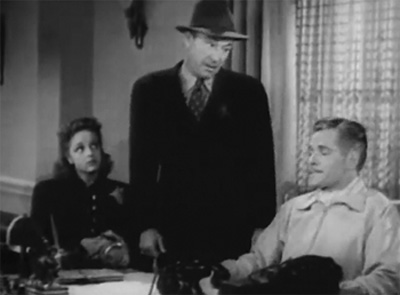 Above left: Robert Armstrong lunches with Kathryn Adams. Above right: Billy Halop pleads for admission to the Sky Raiders offices.