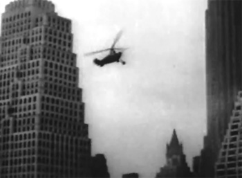 Above: The pursuit plane soars into the clouds (top left), Carey’s plane closes in on the villains’ car (top right), the heavies’ nifty primitive helicopter heads towards their penthouse hideout (bottom left), and the landing gear of Mary’s plane heads for a disastrous fog-caused collison with a phone line (bottom right).