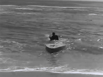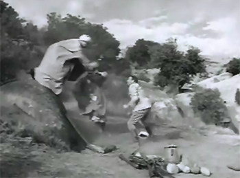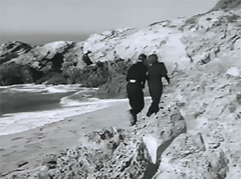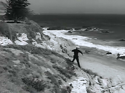 Above: Harry Lauter clambers down the rocks on the Burmatran coast (aka Leo Carrillo State Beach).