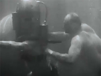 Above left: “Gorth” cuts the hero’s air line in a shot from SOS Coast Guard. Above right: Harry Lauter reacts to Gorth’s attack in new footage, as his diving helmet fills with water.