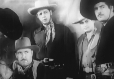 Ernie Adams, like Oakman, manages to steal a few scenes in the role of shifty “Doc” Grover, who fakes his death to help the Raiders frame Jed Scott; his gradual change in expression when he realizes his Raider friends are planning to make his feigned demise into a real one is priceless. Forrest Taylor is characteristically suave and dignified as a upright judge, while Howard Chase is good as a fearlessly honest land commissioner, and Roger Williams is given an annoyingly inconsistent role as the San Ramon Sheriff–who sometimes seems to be untrustworthy, but at other times comes off as scrupulously honest. Jack Kirk is a deputy, and Lafe McKee and Cactus Mack townsmen; Joe Perez makes an extremely brief appearance as Duncan Renaldo’s slain brother in the first chapter. Griff Barnett, who went on to play many A-film character parts in the 1940s and 1950s, has a good showcase as a slightly timid but dependable land clerk.