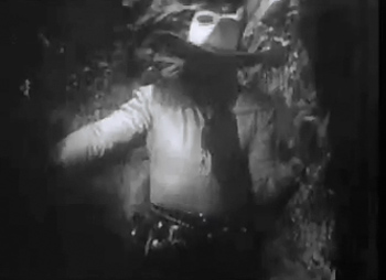 A note on prints: The Lone Ranger Rides Again, like The Lone Ranger, has never become available in a high-quality version; the only existing copy seems to be a very dark and grainy Mexican print with Spanish subtitles–which apparently had its cliffhangers smoothed out to make it into a single lengthy feature; various collectors and DVD-producers have edited this print back to its original episodic form, with uneven results. Eric Stedman’s Serial Squadron print (the source of this review’s images) does the best job of recreating the lost chapter endings that I’ve seen, but is marred by the method used to remove the subtitles–constant cropping and repeated freezing of the bottom of the picture, which is even more distracting than the subtitles. However, the Squadron print is cleaner and less dark than any other extant copies.