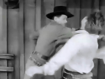 The visual smoothness of Desperadoes’ footage mixture is aided by the fact that its innumerable old outdoor scenes (shot at Iverson’s Ranch) are complemented by equally copious amounts of new outdoor scenes (also shot at Iverson’s); except for the closeups of the heroes and villains when they’re seated atop moving stages or wagons, there’s no process-screen work to be seen in the serial’s many open-air chases and gun battles. Iverson’s isn’t Desperadoes’ only good outdoor location: the large camp around the heroes’ oil derrick (which is either the genuine article or a convincing full-scale mockup) also serves as the setting for several action scenes, and helps to make the serial’s whole battle-for-oil plotline seem more “real” by actually showing us the property that’s being fought over. Republic’s Western-town street provides the backdrop for yet more outdoor sequences; the well-staged gunfight on said street in Chapter Three, and the ensuing fistfight on a second-story balcony, is one of the serial’s action highlights; other highlights include the Chapter Two chase/shootout sequence, the cave shootout in Chapter Five, the horse/buckboard chase in Chapter Seven, the nighttime shootout at the oil rig in Chapter Eight, and the attack on the rig in Chapter Eleven.