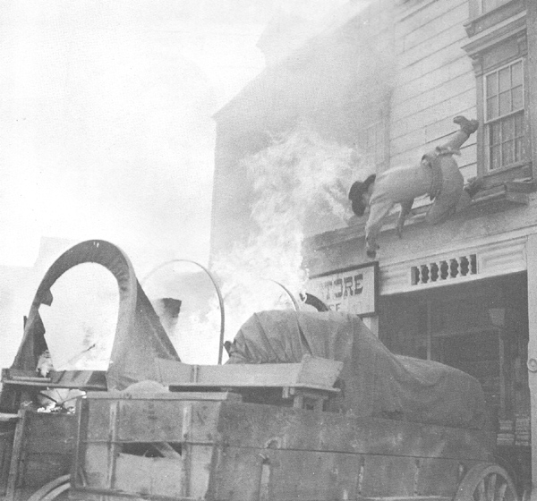Above: Tom Steele, doubling Richard Powers, falls towards a burning wagon to end Chapter Three.