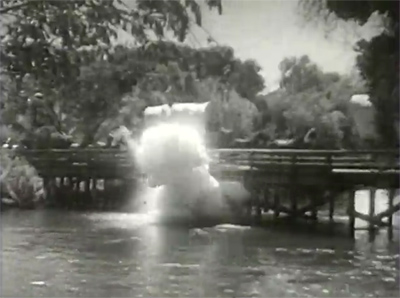 Above: A bridge explodes as the hero and heroine’s wagon crosses it.