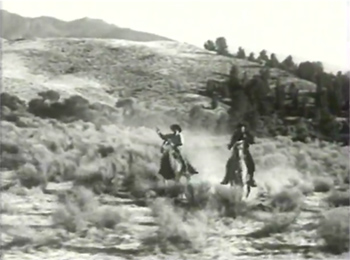 Mail, like all of Universal’s Western serials save Riders of Death Valley, makes some use of silent-film stock footage–as well as stock shots from earlier sound serials. The latter insertions (most of them borrowed from The Oregon Trail) fit far more unobtrusively into the serial than the latter do, although the silent footage is confined mostly to occasional shots of Indians mustering for attack; only the attacks on the wagon train in Chapters One and Two, the assault on the stockade in Chapter Three, and the cavalry-Indian town battle in Chapter Twelve make notable use of silent stock (which, as always, is given away by graininess and different filming speed)–although even these sequences feature plenty of new shots. The cattle stampedes in Chapters Three and Seven use some less familiar stock, which is matched fairly smoothly to the new footage–being assisted in this regard by the deployment of a good-sized group of steers in the aforesaid new footage.