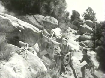 As in Universal’s four John Mack Brown serials, the pines, rocks, slopes, and rivers of the Kernville area are given extensive exposure in Overland Mail; although several sequences take place on the streets of Universal’s Western town or in the studio’s cave set, the serial’s characters spend the majority of their time chasing, trailing, or shooting each other out in Kernville’s wilds. Directors Ford Beebe and John Rawlins do an excellent job of staging their outdoor action scenes so as to show off the scenery to maximum advantage; standout sequences include the pursuit of the stagecoach in Chapter One, the hero’s hillside shootout with the heavies in Chapter Two, the Chapter Three scene that has another coach encountering a herd of stampeding cattle in a narrow draw, the Indian attack at the river in Chapter Five, the heroes’ clash with ambushers later in the same episode, the gun battle around the wrecked stage in Chapter Ten, the horseback chase in Chapter Twelve, the Chapter Thirteen hillside battle, and the good guys’ climactic pursuit of the fleeing villains’ stage in Chapter Fifteen.