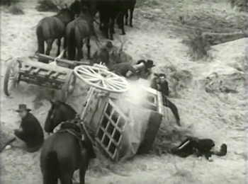 The chapter endings in Mail make use of stock footage as well (most noticeably the powder-barrel explosion from Oregon Trail and the suspension-bridge collapse from Wild West Days). However, the cliffhangers also include several new and elaborately staged sequences, like the Chapter One stagecoach explosion, the bulk of the stage-wreck and cattle-stampede scene in Chapter Three (pictured above), and the bridge explosion and plunge into the river at the end of Chapter Four. Chaney’s apparent burning at the stake for the Chapter Six cliffhanger also consists of new footage–rather surprisingly, since similar scenes appeared in several preceding Universal Western serials; his sidekicks’ clever rescue of him in the ensuing episode is original as well, making no use of the horse-stampede-through-the-Indian-village sequence that originated in Wild West Days and later popped up in both Oregon Trail and Winners of the West. Several of the chapter endings, in standard Universal fashion, are resolved by having the heroes simply live through their peril, but their survival in most cases (as in the aftermath of the Chapter Four river plunge) is at least plausible; the only really weak cliffhanger resolutions here are those that follow the seeming shootings of the hero at the end of Chapters Eleven and Fourteen–which the writer doesn’t bother to explain away with even a “just-a-scratch” remark.