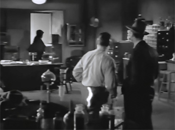 The pool of Crimson Ghost suspects is made up of a quartet of reliable character actors–Sam Flint (genteelly avuncular), Joseph Forte (affably mild-mannered), Forrest Taylor (dignified but sly), and Emmett Vogan (brusque and self-important). All four make the most of their appearances, although the short running time of the serial’s episodes (the standard post-war 13-minute length) deprives them of the scope for red-herring behavior that the similar group in Adventures of Captain Marvel enjoyed. Kenne Duncan has an unusually sympathetic (even heroic) role as Professor Chambers, but plays it well–giving the beleaguered scientist both shrewdness and a dogged courage (his first-chapter defiance of Clayton Moore’s Ashe is particularly good).