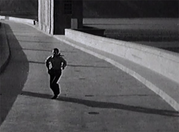 Above, top left: A Ranger car races after the villains along an oil-field road. Top right: The hero springs from a dock to surprise a henchman. Bottom left: The hero crosses a chasm at Corriganville. Bottom right: A henchman atop the above-mentioned dam.