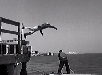 A few of the action highlights include the hero’s short but dramatic cantina gunfight with his father’s killers in Chapter One, the Chapter Three seaside sequence (which includes an eye-catching leap from a dock and a transfer from one speeding motorboat to another), the fights outside and inside the mine in Chapter Four, the multiple fistfights, gunfights, and chases arising from the back-tracking of the oil line in Chapters Six and Seven, the escape from the Mexican fort in Chapter Nine (which begins with a shootout, segues into a horse/wagon chase, and ends with a leap into Lake Sherwood), Chapter Eleven’s dynamic fistfight and ensuing horseback chase, and the rousing aerial battle with the zeppelin in the final episode. Tom Steele doubles star Sammy Baugh in the fight scenes, with Dave Sharpe taking over for the more acrobatic stunts–like the spectacular wire-slide from the top of an oil derrick in Chapter Six. Sharpe also stands in for sidekick Duncan Renaldo in that Chapter Eleven fistfight, with Ken Terrell doubling for his villainous opponent. Both Terrell and Sharpe double several other heavies throughout the serial–as do (among others) Jimmy Fawcett, Duke Green, Duke Taylor, Joe Yrigoyen, and Bud Wolfe.