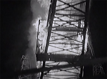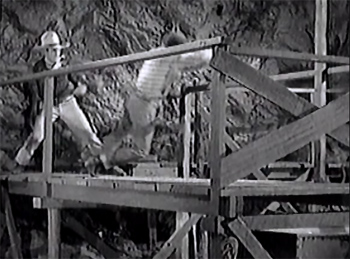 The hero’s Chapter One race through a ferocious oil-field fire in search of the captive heroine is another of the serial’s action highlights; the Lydecker Brothers’ stunning miniature work here ranks as some of their very best. This sequence leads to the first of several excellent chapter endings (a blazing oil derrick toppling onto the protagonists); other standout cliffhangers include the runaway mining-car scene in Chapter Four, the hero’s Chapter Six fall from his horse into a chasm, and the Chapter Seven ending that has a heavy barreling a truck into a cabin containing the hero. The Chapter Two train-tunnel explosion and the exploding truck’s plummet from a dam at the end of Chapter Eleven are also first-rate; both were borrowed from Republic feature films (The Great Train Robbery and Born to be Wild, respectively) but work beautifully here, being edited into the serial in Republic’s customarily smooth style.