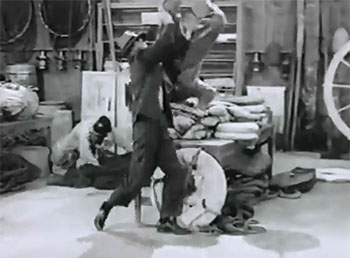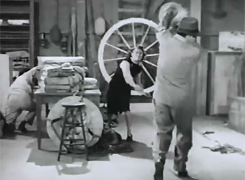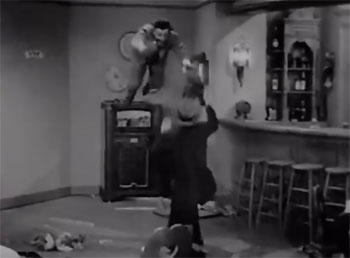 Above left: Helen Thurston (doubling Lorna Gray) hurls a jar at Dale Van Sickel (doubling Roy Barcroft); Bud Wolfe is ducking in the corner. Above right: Tom Steele (doubling Kirk Alyn) tosses Van Sickel through the air in another fight in the same prop-filled location (a marine-supply warehouse), with Bud Wolfe again in the background. Both scenes are from Chapter Two.