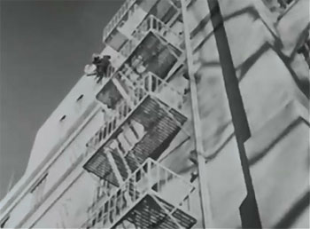 Above left: Van Sickel makes an impressive leap onto Steele during the café fight. Above right: A good up-angle shot of the fire-escape fight.