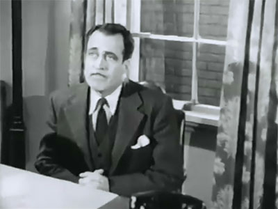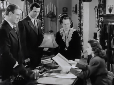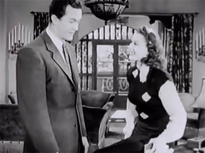 Above: Hero and heroine discuss the death of a crook who made his living through phony marriages with wealthy women (Dolores: “I wonder if any of the ladies he left waiting at the church will attend his funeral.” Cliff: “I doubt it, but some of them may send him orange blossoms.”).