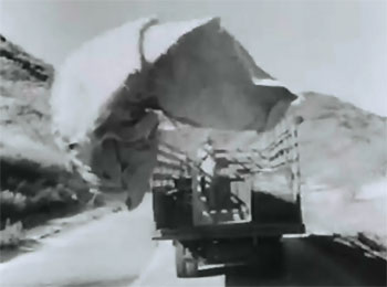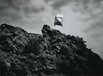 Above: Barcroft unleashes a tarp (left) that encases the good guys’ car and sends it flying off a cliff (right) to end Chapter Five.