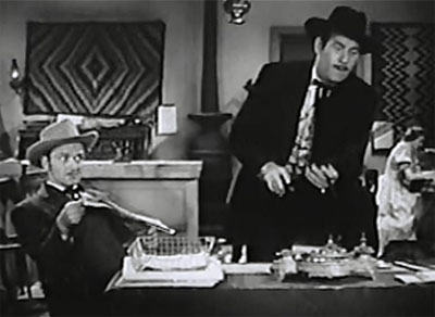 Above: Roy Barcroft casually fiddles with James Craven’s disguised cane-gun, much to Craven’s discomfiture. Dorothy Fay is in the background.