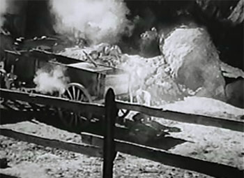 Other cliffhangers in Eagle are sound in conception (the explosion in the pass, the rock falling on the shack, the powder-barrel tossed into the mine, etc.) but are undone by their completely unbelievable resolutions; in almost every case, the hero simply crawls out from under the boulders or beams that have seemingly crushed him and dusts himself off. Then there are the chapter endings that are so silly to begin with that they can’t possibly be damaged by their absurd resolutions–the prize examples being the barrel-roll and the telegraph-spool sequences mentioned above. Horne serials as a whole use the “he lived through it” cliffhanger resolution so regularly that it’s hard not to speculate that the director staged his escape scenes this way deliberately, as a way of spoofing other serials (particularly Universal outings) that made periodic use of such cop-outs.