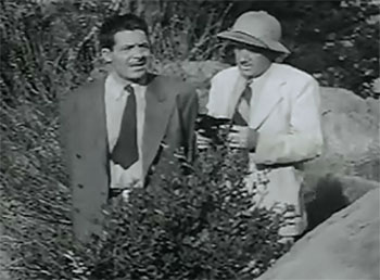 Above left: The pith-helmeted Jack Ingram refuses to tell Hugh Prosser where’s he’s going. Above right: John Merton (with radio mike) and Wheeler Oakman eye each other suspiciously.