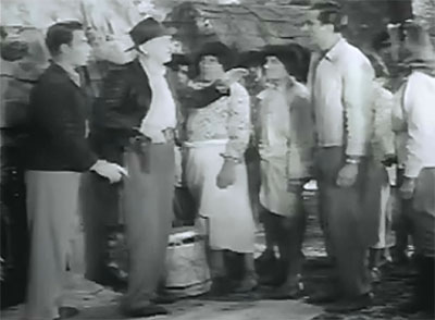 Yet more narrative padding is provided by one of producer Katzman’s favorite cost-cutting devices–numerous shots of characters walking to and from various locations; however, the scenery they walk through (the Monogram Ranch and Kernville, chiefly) is certainly well worth looking at, even if it doesn’t really resemble a tropical or even semi-tropical island. The big “stamp mill” (which looks rather like a working lumber yard) and the Indian village with its stone buildings and wide village square also provide good outdoor backdrops for the action scenes. The action scenes themselves are generally small-scaled, but are not bad at all, thanks to the expertise of stuntmen Eddie Parker and George DeNormand; the fight on the hillside in Chapter Eleven, the fight in the cave in Chapter Twelve, and the fight in the back of a moving truck in Chapter Thirteen are particularly well-done. Director Wallace Fox adds some unexpected visual flourishes to the last-named sequence, using a series of quick close-ups of the combatants to liven up the scene.