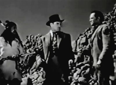 Katzman regular Marshall Reed has the best role of his chapterplay career in Geronimo, and makes the most of it. His Rankin is a rather unusual villain by serial standards–a brains heavy who’s slick and crafty enough to outsmart his opponents (until he meets his last-chapter doom), but also rugged enough to outfight and outshoot them when he has to. The brawny Reed is quite convincing whenever Rankin gets physical, but is equally believable when the lawyer is engaged in prevarication, scheming, or non-physical villainous activities; he lies to other characters in such commandingly resonant tones that you can’t blame them for believing him, and outlines his plans in a cold and calmly arrogant manner that’s quite intimidating. John Crawford, as outlaw leader Ace Devlin (who’s bullied into becoming Rankin’s henchman early in the serial), drops his usual smoothness and makes his villain seem rough-hewn, generally easygoing, and almost likable at times, providing a nice contrast to Reed’s icy, ramrod-like Rankin.