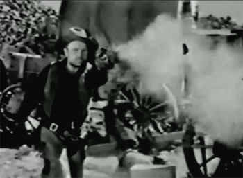 The smirking and swaggering Zon Murray is well-cast as loud-mouthed Bat, the most rebellious member of the Rankin/Devlin gang; Oklahoma-born stuntman Sandy Sanders is also good as Cliff, another leading henchman, coming off as a rough but cagy customer. Rick Vallin is a background henchman, only briefly becoming prominent when his character is captured by the heroes; the other background outlaws are an unfamiliar and largely nondescript group. Most of the minor non-villainous players are similarly unfamiliar; several of them, from their amateurish line delivery, seem to be wranglers or locally-recruited extras, not professional actors. There are at least four well-known faces to be seen in small character turns, however: Frank Ellis has a small but important bit as a gruff pioneer, Lyle Talbot pops up as a jovially dignified Army colonel, John Cason figures in a couple of chapters as a ruggedly stalwart wagon-master, and a characteristically stern Chief Yowlachie puts in a last-chapter appearance as the elusive Geronimo.